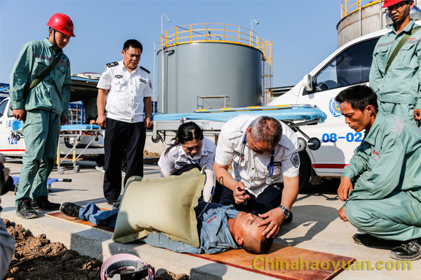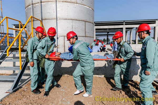 演练假想开云(中国)公司园区正在建设的年产6000吨二甘醇胺项目配套罐区,某防腐公司4名员工对在建二甘醇胺储罐内部进行防腐受限空间作业,因天气炎热,通风不良,2名工人在罐内工作时先后晕倒,外面监护的1名工人呼叫没有反应,随即进入罐内施救,罐外还留一名工人监护。进入罐内救援的工人告诉外面监护人员,罐内闷热,呼吸困难,正准备将2名工人移出罐外,但是在移动罐内人员时感觉乏力,无法移动,施救人员也晕倒在罐内。罐外监护的工人赶紧寻求帮助,正好遇见路过此处巡检的操作人员,操作人员迅速了解情况,紧急将情况汇报公司领导。公司领导立即组织人员自救,联系120急救中心人员救援,并逐级向市应急局、市政府汇报事故情况。