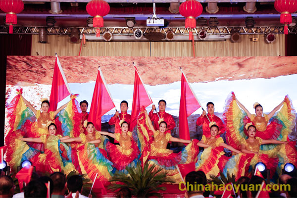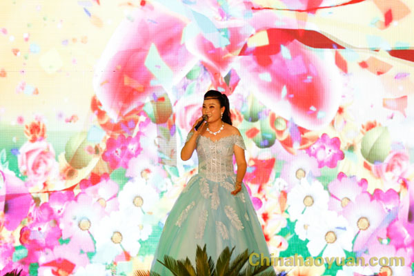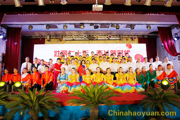 晚会结束,公司领导依次走上舞台,向演员们表示问候,并与演员合影。