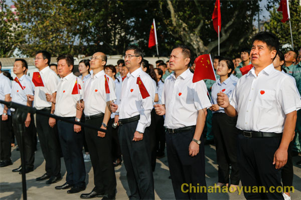 上午8时18分,升旗仪式开始。鲜艳的五星红旗在庄严的国歌声中冉冉升起,凡殿才等公司领导同员工代表注视着五星红旗,齐唱国歌。