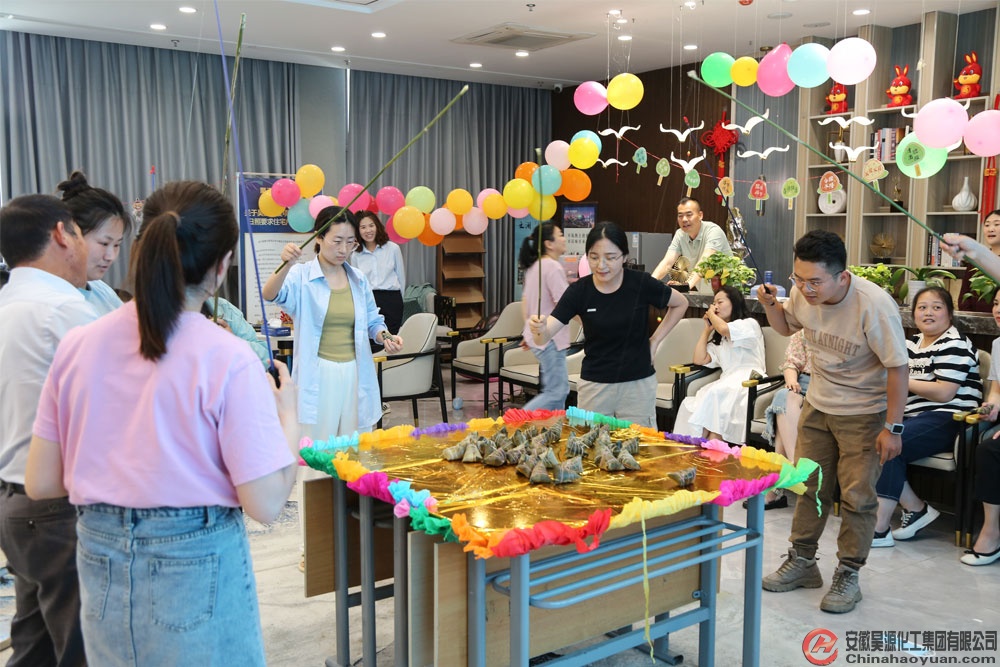 首先进行的是“钓粽子”环节。说到关于粽子的游戏,大家首先想到的就是吃粽子和包粽子,但是“钓粽子”还是头一回。只见大家兴致勃勃地拿起 “钓竿”,争先恐后地钓粽子。为了能让钓钩顺利地钓起粽子,大家纷纷使出洪荒之力。有的双手紧握钓竿,踮起脚尖;有的眯起眼睛屏住呼吸。从全神贯注地下钩到紧张得满头大汗,以及钓到粽子后开心地跳起来……,动作滑稽、千姿百态,引得众人哈哈大笑。