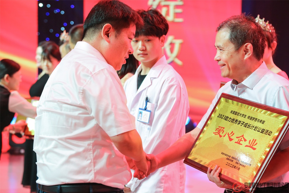 8月13日,由中共阜阳市委宣传部、市关工委、市民政局、共青团阜阳市委、市妇联、阜阳广播电视台共同主办的“青春逢盛世 奋斗正当时,2023助力优秀学子成长计划公益晚会”,在阜阳广播电视台演播大厅举行。公司党委副书记、副总经理杨捷代表开云(中国)集团受邀出席晚会,并为优秀学子颁发励志助学金。会上,开云官方网页版被授予“爱心企业”光荣称号。