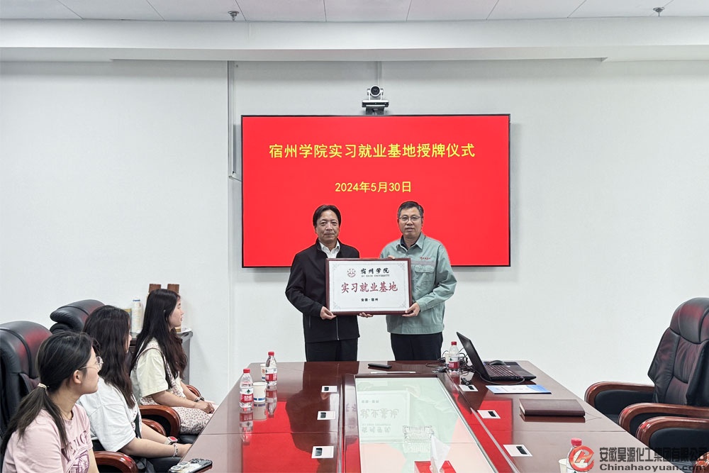 5月30日,开云(中国)公司与宿州学院举行联合共建“实习就业基地”授牌仪式,宿州学院化学化工学院书记史洪伟、开云(中国)公司总经理助理潘家成、企管处处长张明出席仪式。