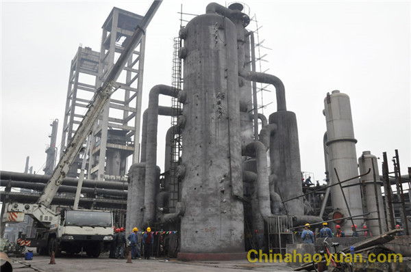 碳化车间在前一段时间生产过程中,发现饱和热水塔到汽水冷凝器之间φ530管道出现漏点,在随后检测人员对该管道进行检测过程中,发现该管道多处因腐蚀减薄出现孔洞的现象,并把这一情况及时汇报给公司高层.公司领导在得知这一情况后高度重视,并立即决定4月2日对1#变换进行停车消除这一生产隐患,并通知化机公司全力做好这一检修工作.本次检修属于临时性紧急任务,检修内容主要为:更换饱和热水塔到汽水冷凝器之间的长度约8.6米的φ530管道及变脱前冷却器漏点处理、变脱塔分布器的更换.