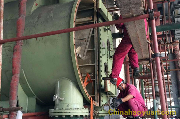 6月14日,气温偏高,但是为了保证生产稳定性,净化车间部分操作工和维修工在管理人员的带领下顶着烈日、加班赶点,对一期合成机组凝汽器进行检修。