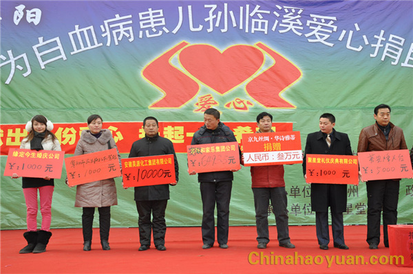 12月25日上午,在阜阳市苏果超市门前为白血病患者孙临溪小朋友爱心捐助活动现场,公司工会副主席杨波代表公司捐助10000元爱心款。