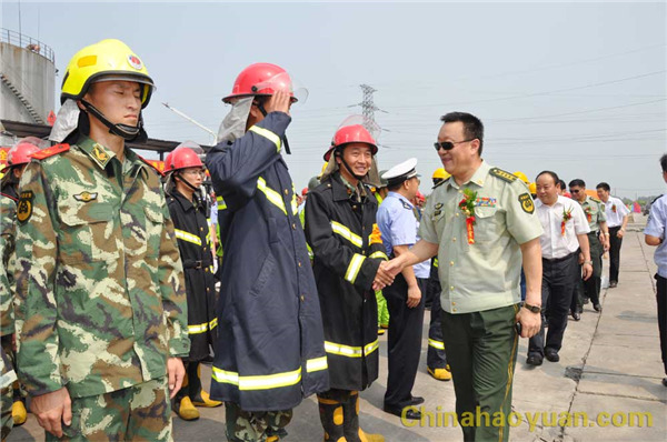 省公安消防总队副总队长刘德义, 市委常委、常务副市长李平,市委常委、政法委书记、公安局长许刚,集团公司董事长郑高潮等及市职有关部门和单位领导现场观摩演习。