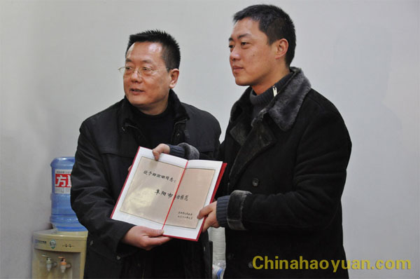 1月4日,阜阳市总工会副主席马跃进、经济部部长杨建才一行受市委、市政府的委托,来公司为党委书记、董事长郑高潮颁发市2011年度劳动模范荣誉证书,表达党和政府对劳动模范的关怀,并为公司全体员工带来了新春祝福。