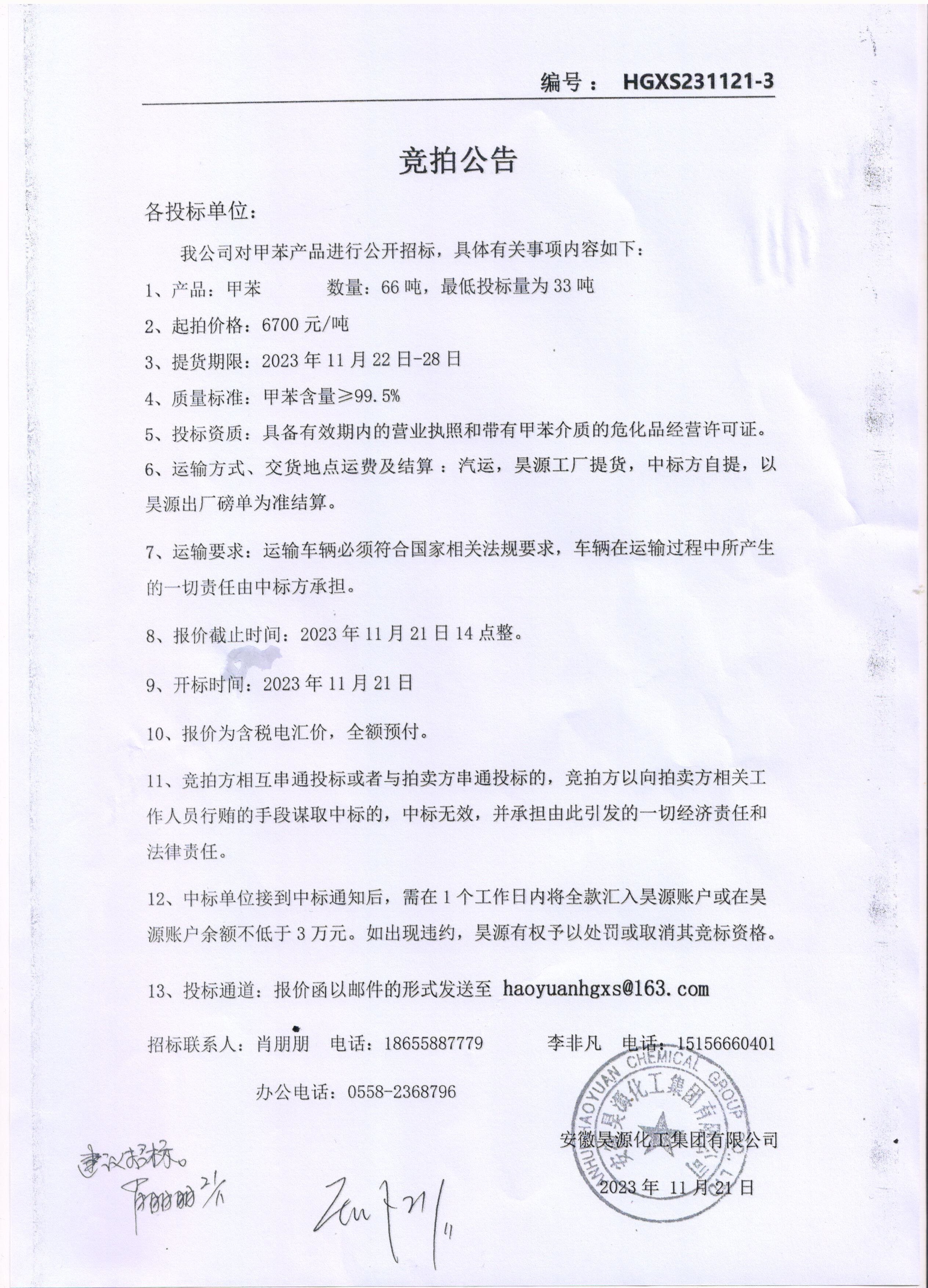 化工销售公司甲苯产品招标公告