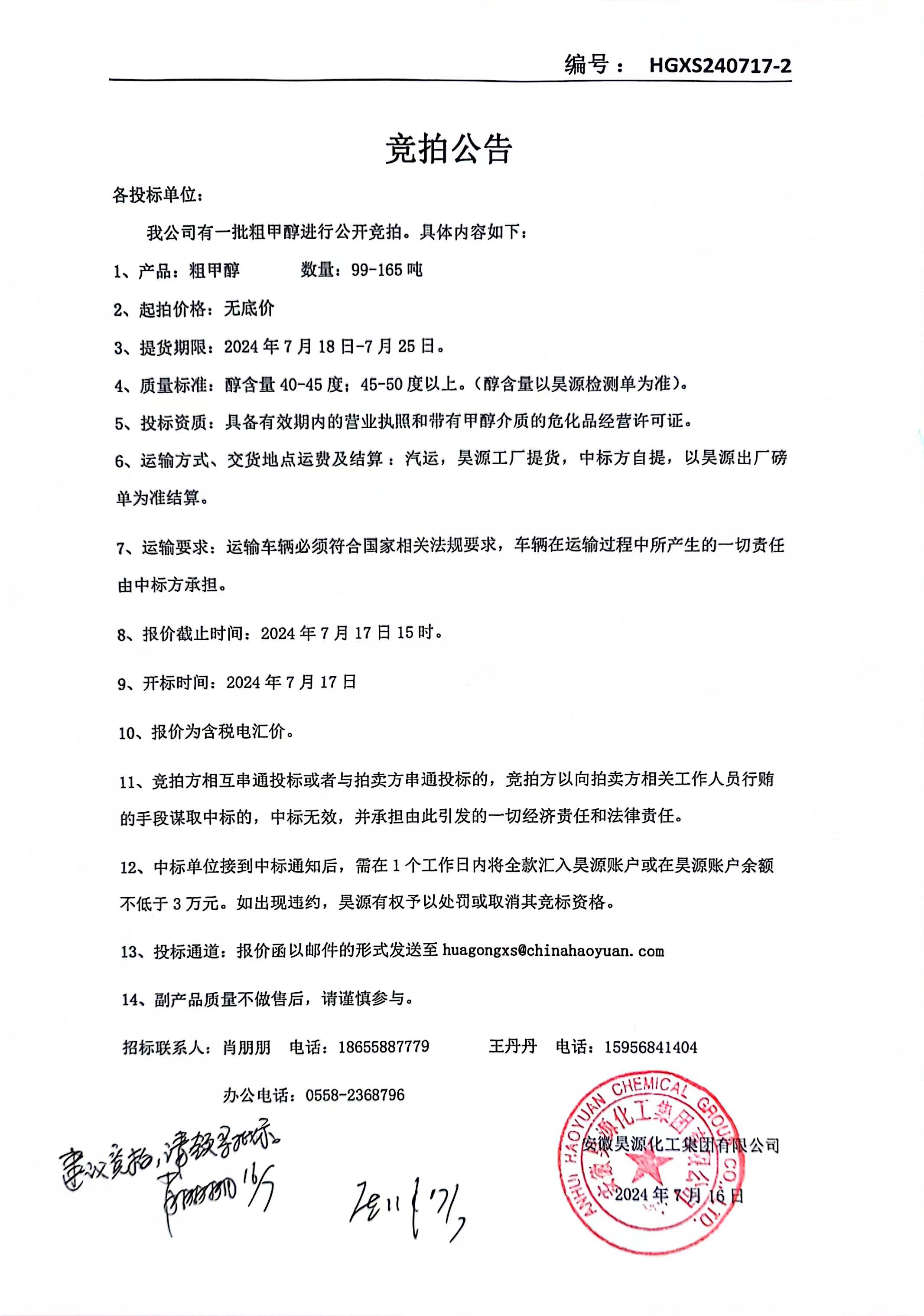 化工销售粗甲醇招标公告