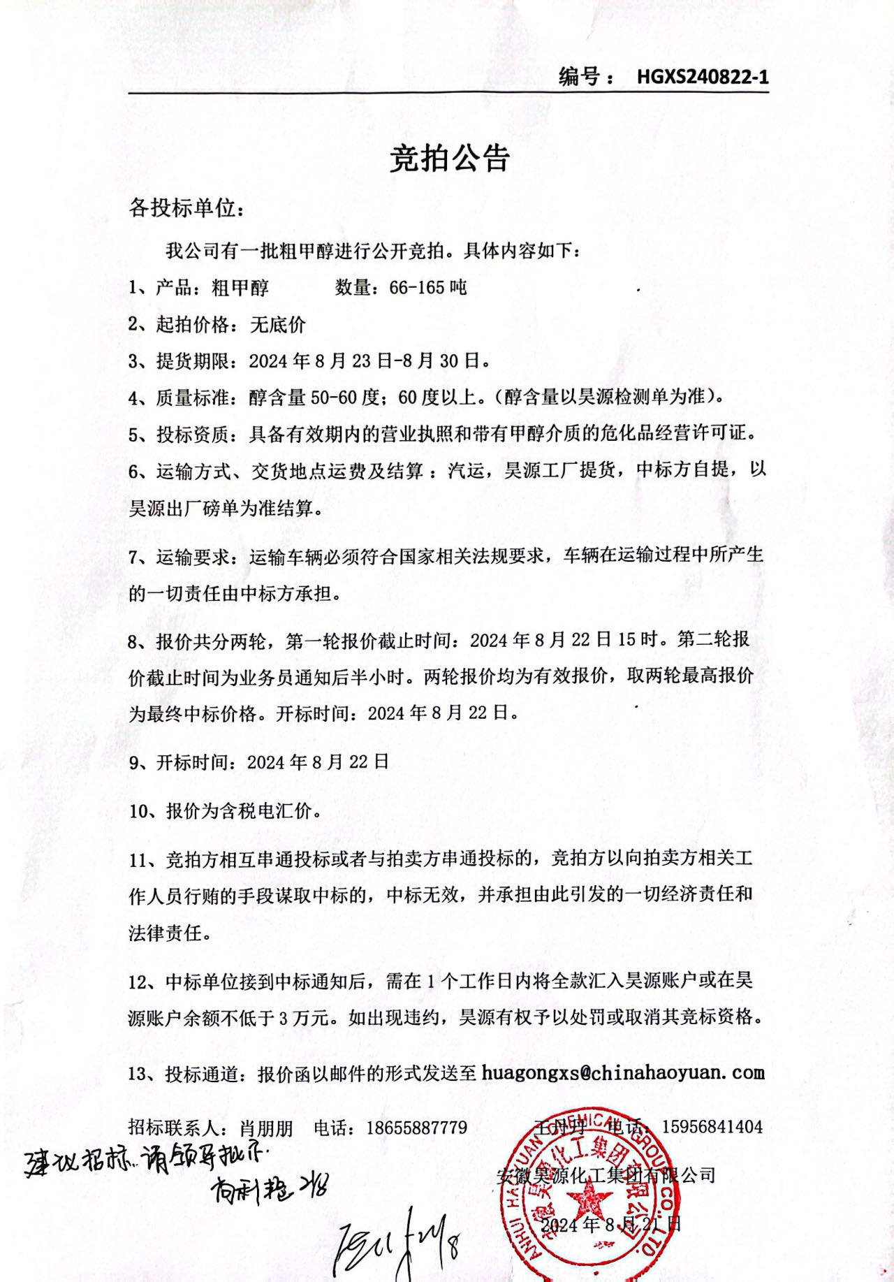 化工销售粗甲醇销售招标公告